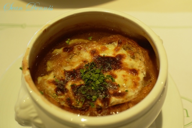 牛排館起司麵包洋蔥湯:微微酸淡淡甜,濃厚的紅蔥酥味,正統的味道