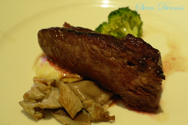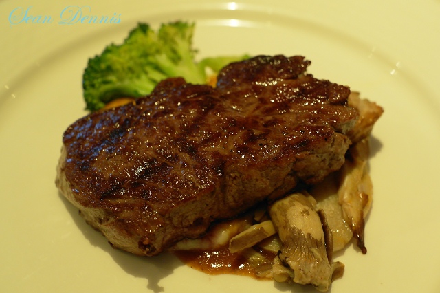 爐烤美國沙朗牛排(五分熟)佐芋泥青花菜鮑魚菇:鮑魚菇算是菇類裡較便宜的