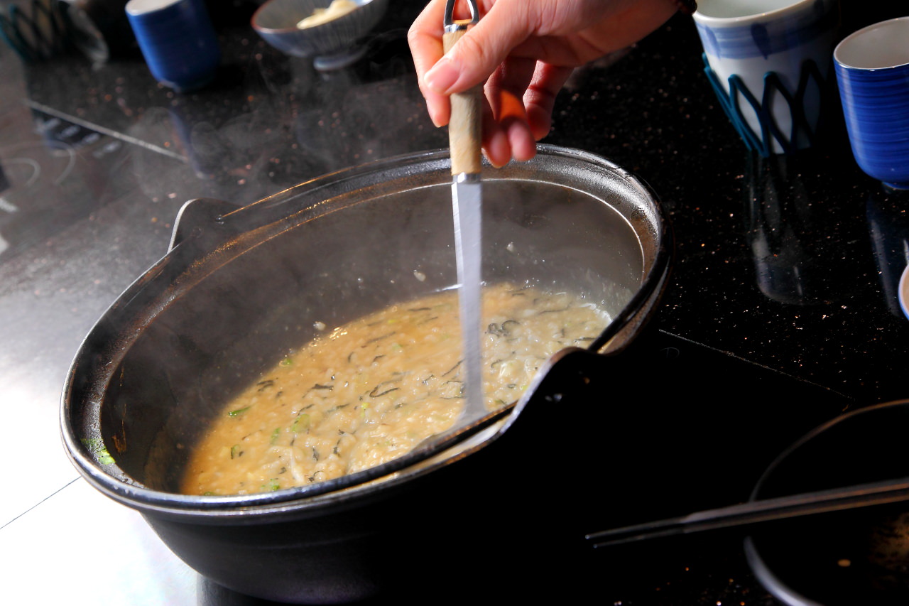 服務生會先將湯鍋裡面的餘料撈完,接著倒入白飯高湯燉煮