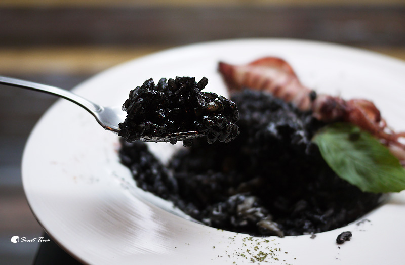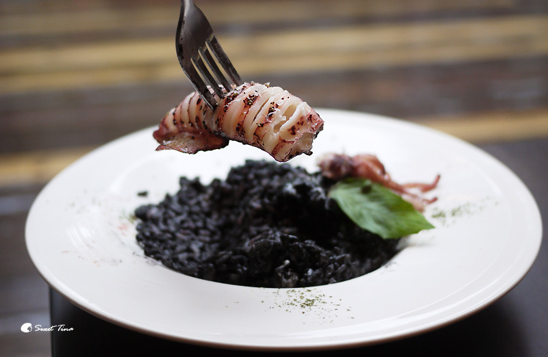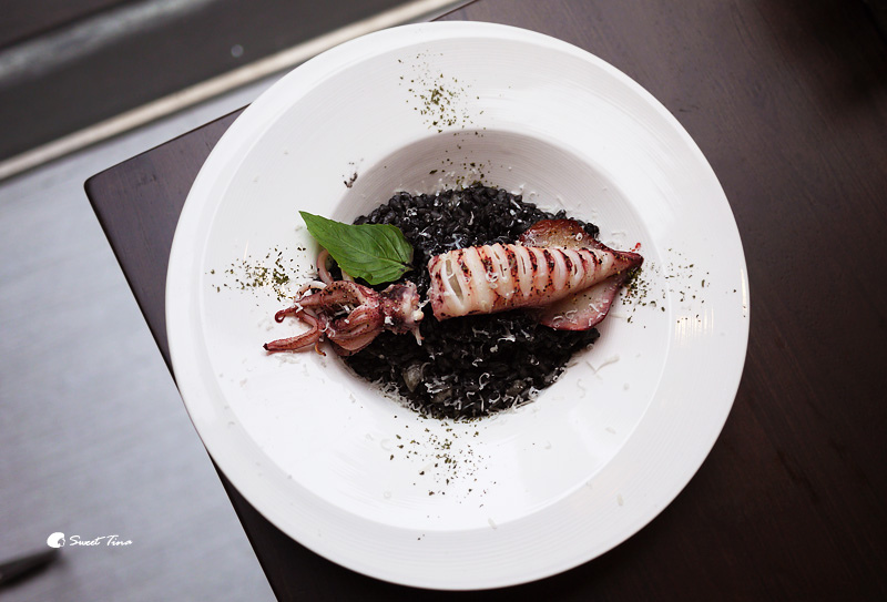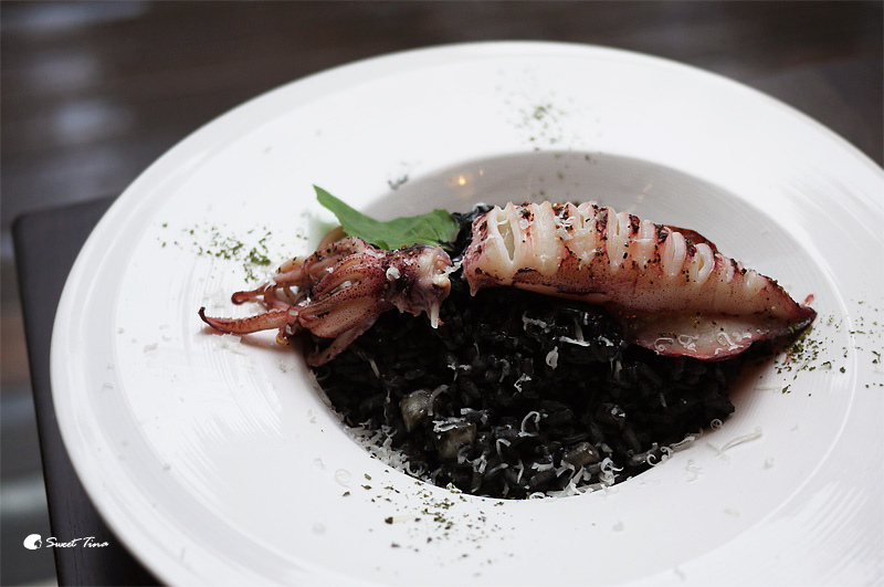 墨魚花枝燉飯 - 黑嚕嚕的墨汁米飯搭上整隻花枝,視覺上還滿享受的呢。
