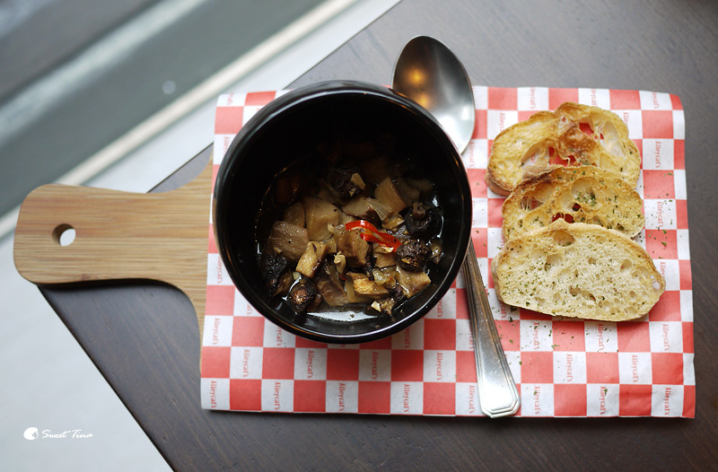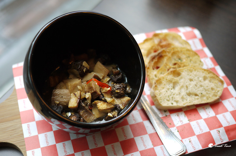香蒜炒磨菇 - 炒過的磨菇香氣十足,屬於中辣的口感,搭配法國麵包特別對味。