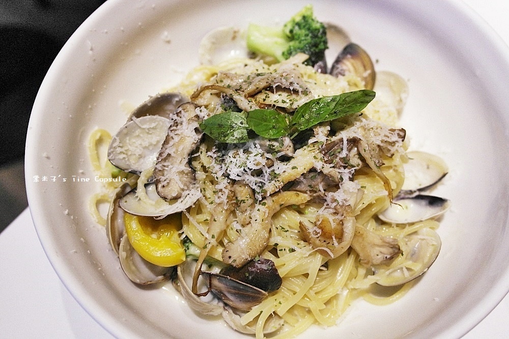義大利麵吸附了新鮮蛤蜊的鹹香、蕈菇特有的香氣,