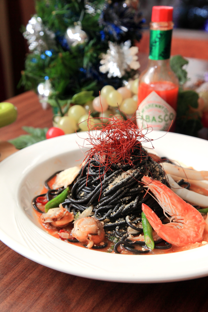 海鮮配料也十分豐富,有帆立貝、花枝圈跟蝦子,醬汁有著濃郁的蒜香帶點微微的辣椒香氣及辣度,適合口味比較重的朋友