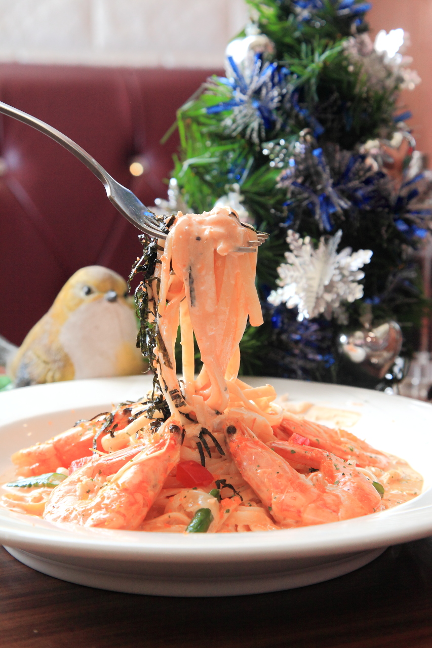 今天剛好有細扁麵,像奶油醬跟細扁麵相當搭,濃稠的奶油醬均勻的掛在麵條上,醬汁稍稍帶點粉紅色,那是鮮蝦頭的蝦紅素,可鮮的勒!