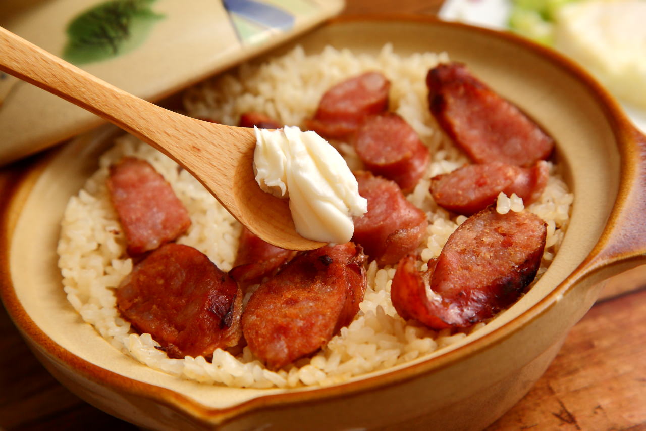 永山香腸的瘦肉比例較多,用來蒸飯油脂稍微少了一些,所以我們可以利用隨手可得的奶油來增加米飯的油潤感,一點點就好,趁熱拌進香腸飯裡,順便把香腸剁成小塊