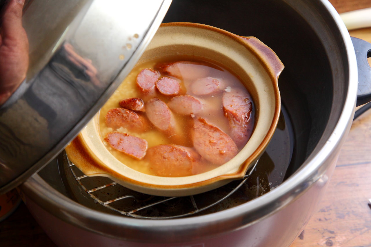 香腸要先煎過才香,將煎過的香腸直接放入白米裡,就照一般煮飯的方式煮就可以了(正統港式是用陶鍋生米煮成熟飯,因為一般家庭沒有火力那麼強的爐火,所以我們用蒸的就好)