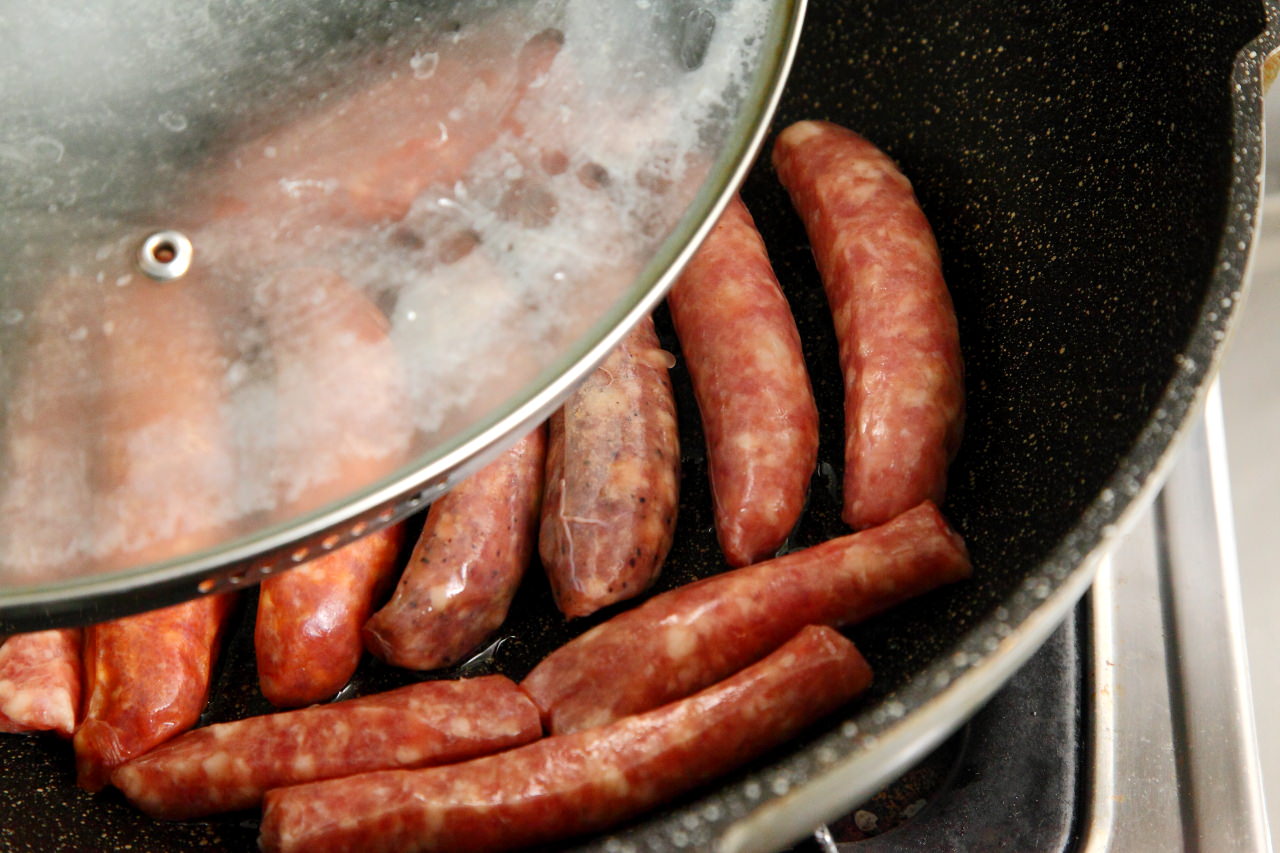 等到鍋裡的水分稍微蒸發後就可以打開鍋蓋來滾香腸囉!腸衣裡面的肉汁滾滾,看起來超誘人的,而且香氣不段從鍋裡竄出!