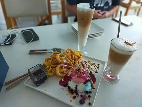 鬆餅上面放上一些珍珠,旁邊再附上一小杯的珍珠