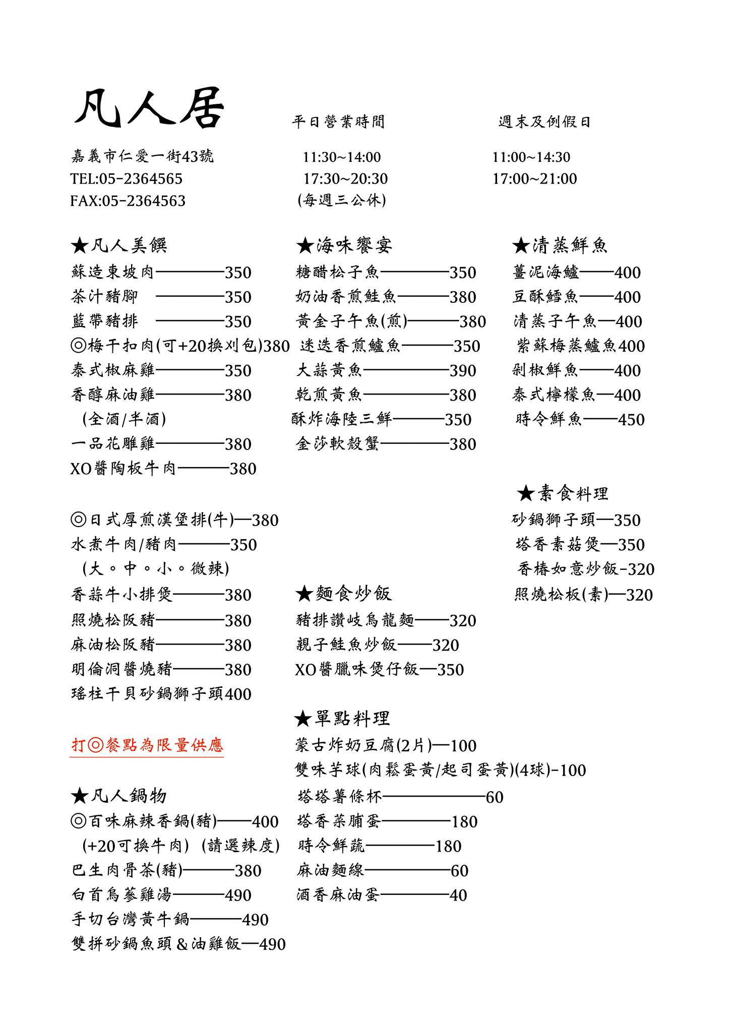 套餐附有:白飯、三樣小菜、當日湯品、甜點or水果、飲料(飲料換購單點飲料可折抵40元)。用餐時間2小時,最低消$200元(採不累積,140cm以下不收低消),不加收10%服務費,餐點大多是大眾喜愛的中式料理,看到菜單…每道菜都好想品嚐。