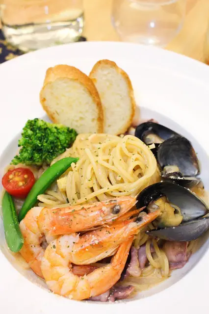 鮮甜的大白蝦、小巧Q彈的淡菜。好一份可口淡香奶油、濃郁海鮮的義大利麵,很喜歡。