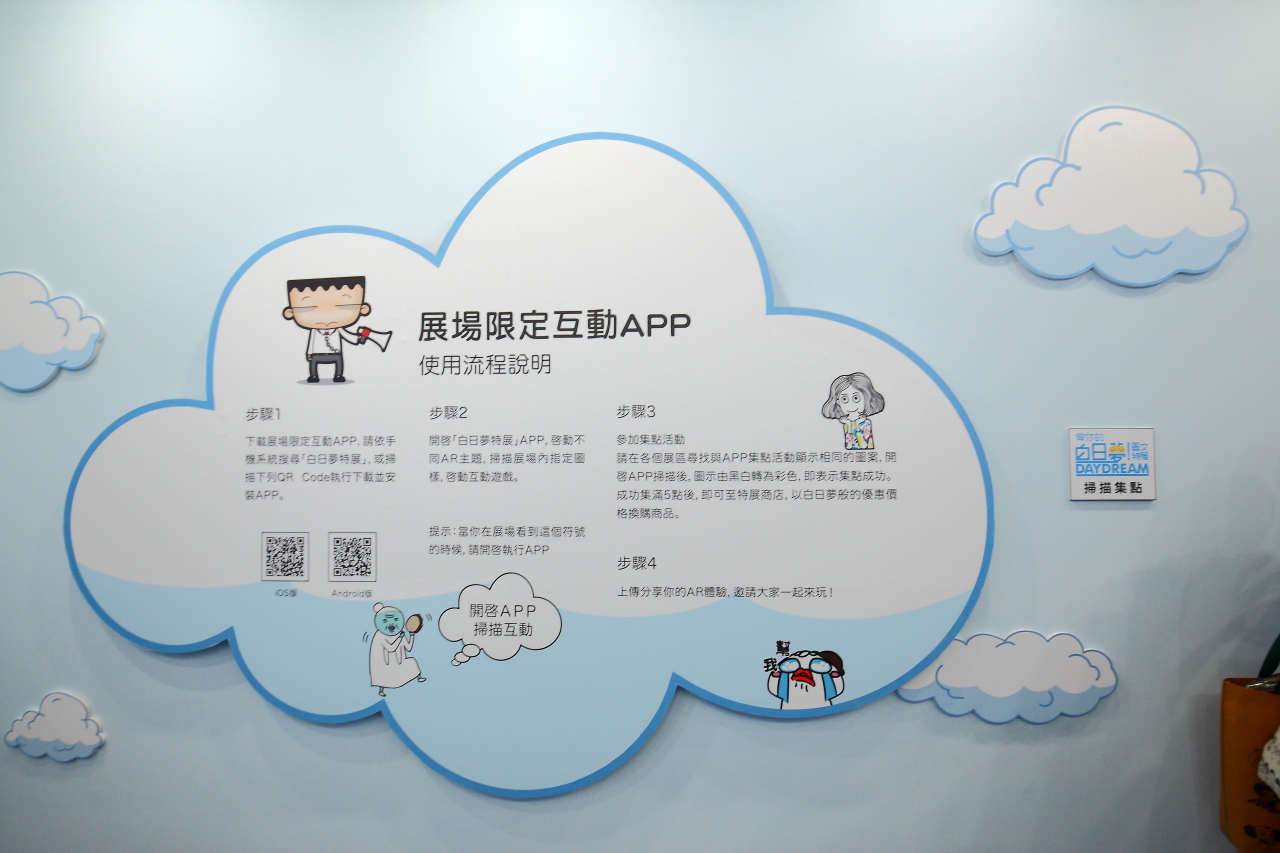 這次的做你的白日夢!圖文特展首創圖文特展專屬APP:AR擴真實境,於各區的特定場域使用專屬APP,虛擬角色將化身眼前伴遊,互動科技讓看展更多樂趣呢