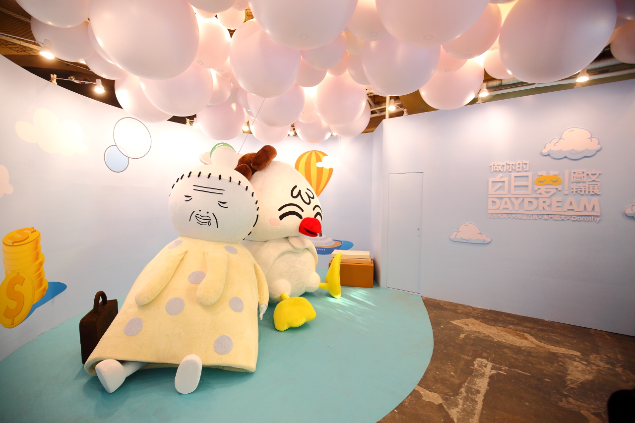 一進到展場,就讓人意圖快門按不停!300公分的巨人角色布偶現身眼前,毛絨絨軟綿綿的觸感,彷彿置身夢境,開放近距離接觸,快來旁邊睡下,跟「馬克、雞姐、鬼門阿嬤、Dorothy」一起做個香甜好夢,準備進入夢的世界囉