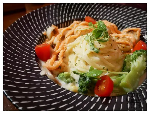 我點了份美式版本的藍鑽蝦明太子義大利麵以及香寧奶油雞肉義大利麵,