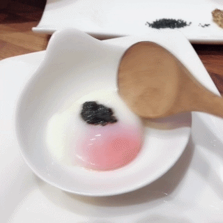 這半熟蛋選用的也是台灣的養生紅蛋,上頭搭配上一點黑松露醬,