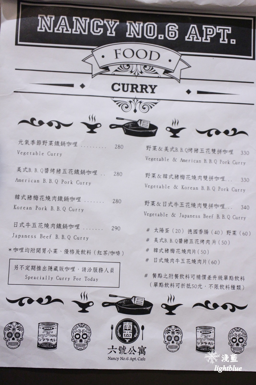 咖哩提供時間為用餐時段(11:30~14:00、17:30~21:00),鐵鍋鬆餅提供時間為下午茶時段(14:00~17:00),兩個時段的菜單不同,這是下茶時段的菜單,主要提供輕食與沙拉