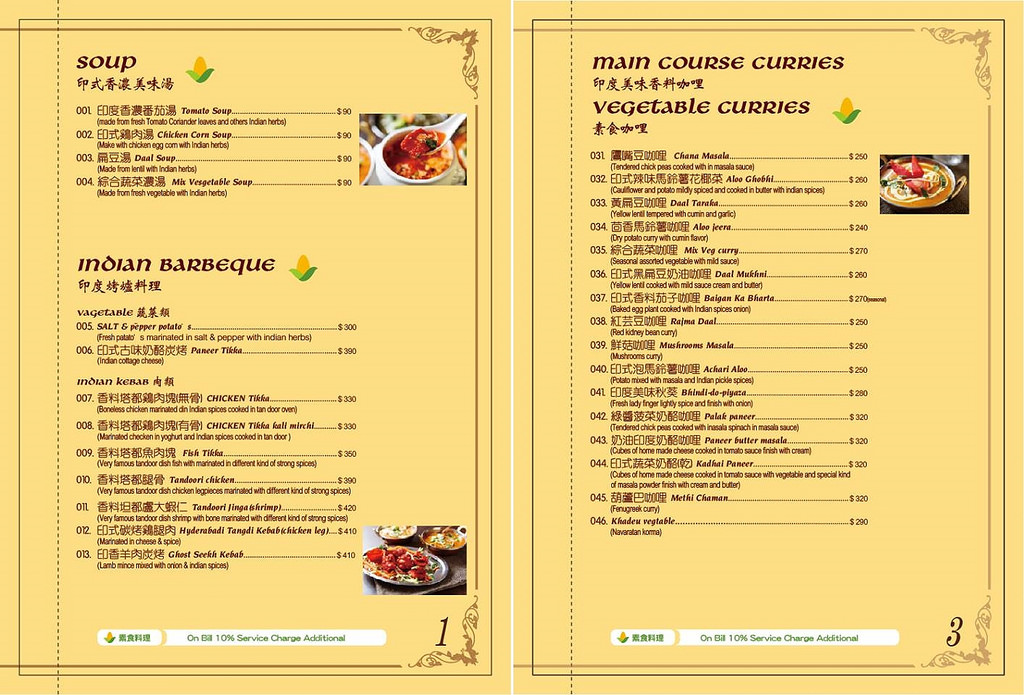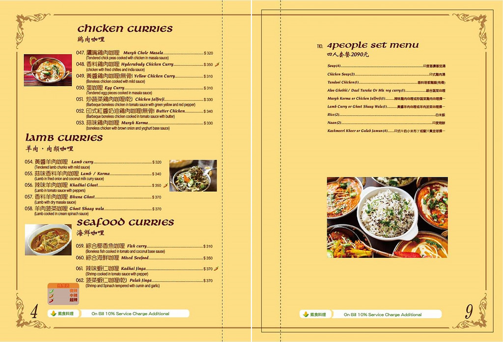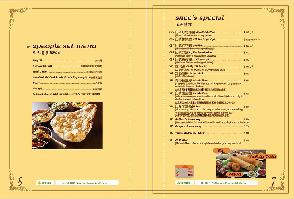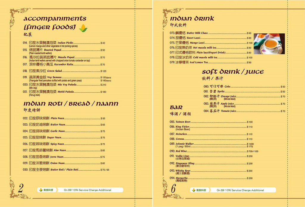 菜單從配菜、烤餅、咖哩到特色小點,菜色可是遠比想像中還要豐富,其中瑪莎拉豆沙、印式甜甜圈、豆蒸糕、炸乳酪捲、辣椒雞,都是一些我覺得相當特別的餐點,你可以單點,這邊也有雙人及四人套餐可以組合搭配品嚐。(點菜單可放大)