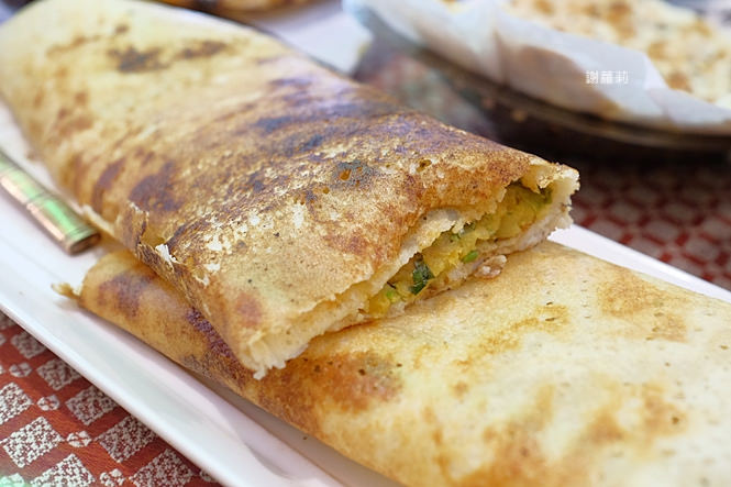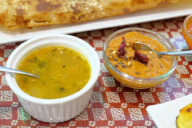 外層薄脆、有點像是硬式的可麗餅,內餡有米食、馬鈴薯、葫蘆巴、扁豆,你可以單吃、也可以沾著佐醬一塊享用,這個特殊的印度菜我自己可是超級喜歡。