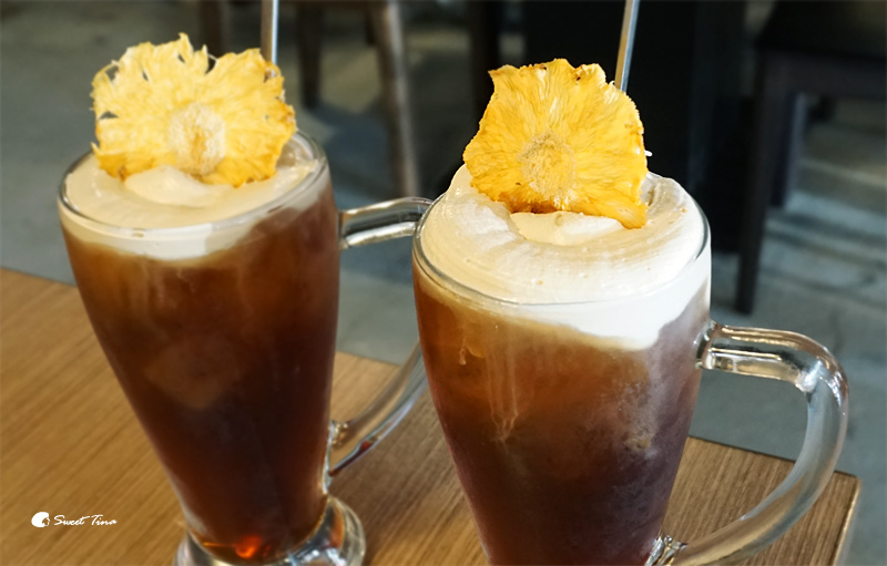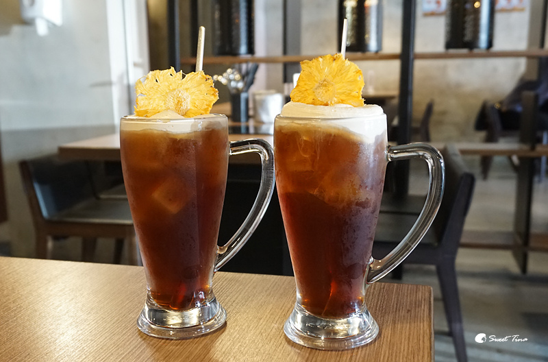 最上頭是鳳梨乾,底下的奶蓋帶點海鹽及牛奶糖的香氣,沿著杯緣喝,可以喝到不同漸層的口感,還滿棒的。