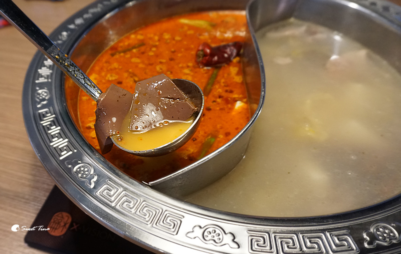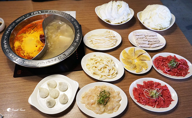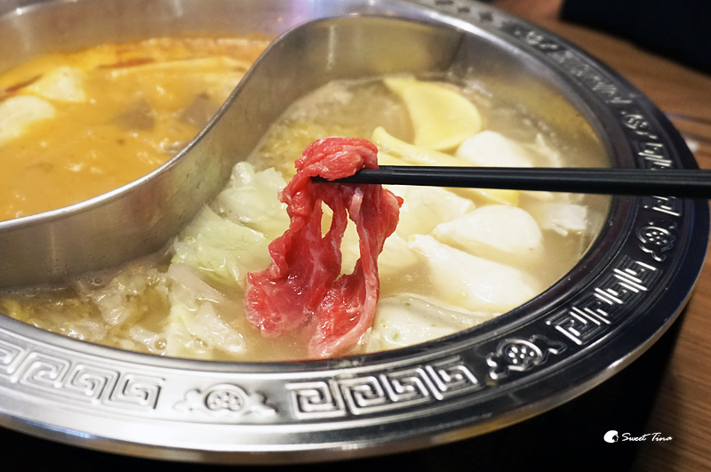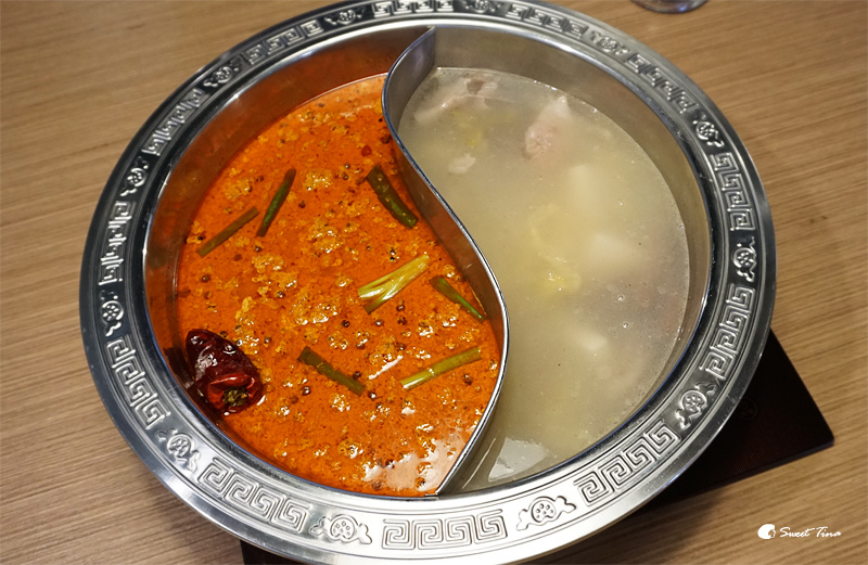 鴛鴦鍋搭配的是麻辣鍋及酸菜白肉鍋。