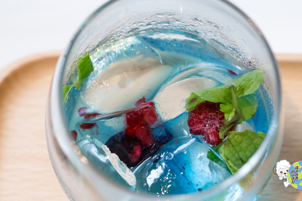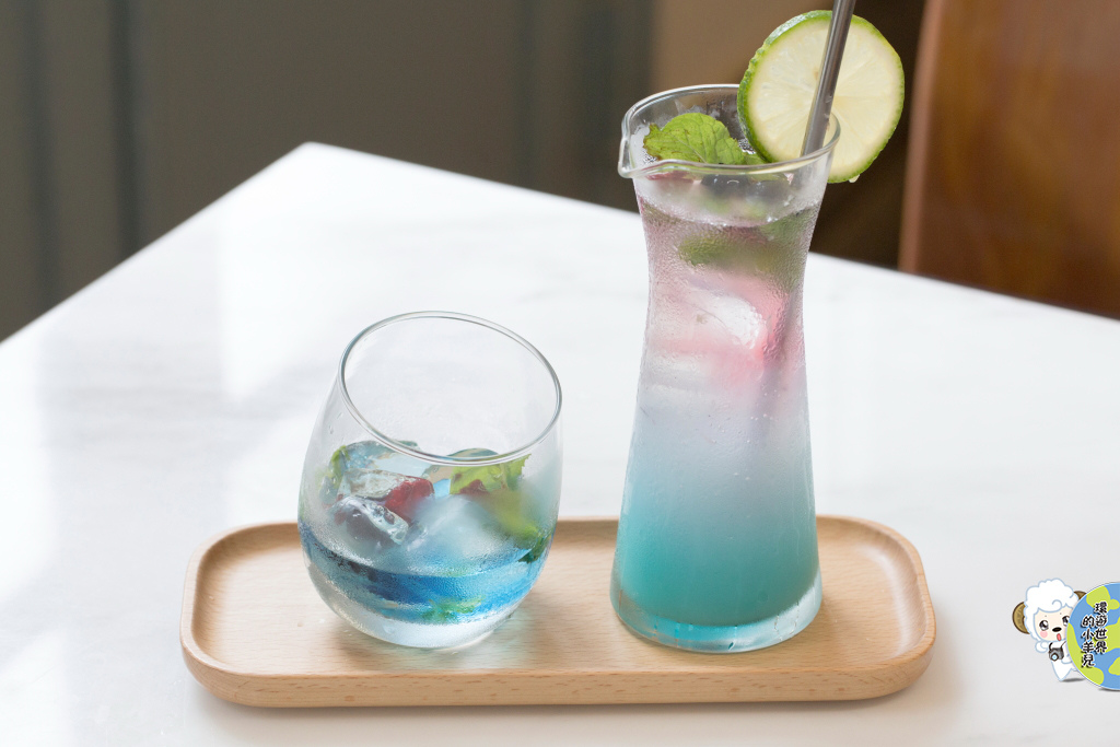 運用藍柑菊、可爾必思、檸檬汁,特調出水色Mojito Soda。
