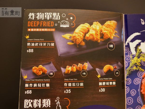 除了丼飯外,盛之丼也有提供炸物單點與飲料,單點炸物有奶油起司菲力豬、酥炸廣島、炸雞蛋豆腐與咖哩可樂餅都是經典日式炸物,而且菜單的圖示很貼心,都有說明一份有幾個,不會讓人擔心點太多吃不完喔。