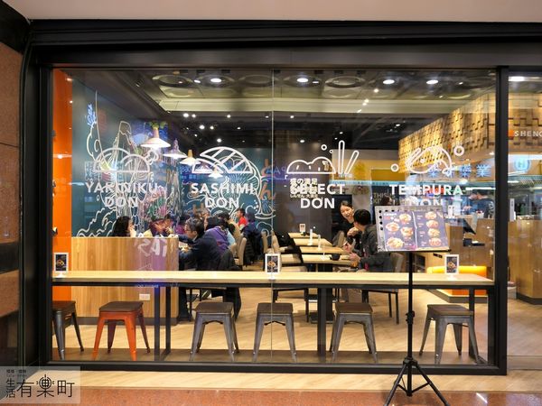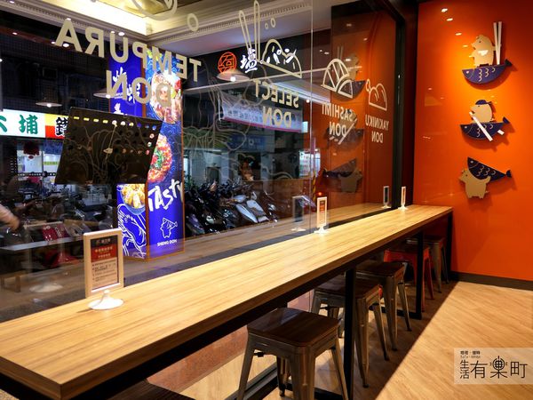 明亮的招牌和落地窗的,上頭有可愛的丼飯圖示,馬上讓人看了就知道是家日式丼飯專賣店喔。盛之丼的LOGO也很容易辨識,看到可愛的小豬拿著筷子乘坐在魚形的碗中,整體來說就是一碗豐盛丼飯的意象,非常有設計感。