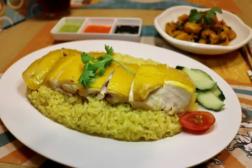 瑞記海南雞飯使用當天現宰雞肉,在海南雞中加入薑黃,以高溫泡熟後,再冰鎮,冰鎮過後肉質香Q有咬勁,香嫩誘人,讓許多老饕們都為之瘋狂