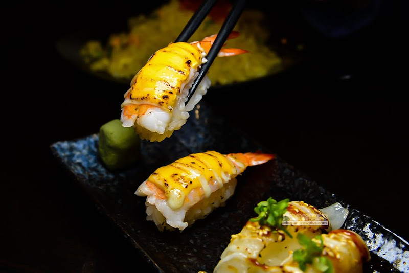 起司鮮蝦握壽司,在熟悉的蝦壽司上覆蓋上一層起司,用噴槍炙燒,這樣的做法挺有意思的,軟嫩蝦肉加上一層起司,吃起來有口感也有奶香味,佐以美奶滋醬吃起來甜甜的,是大眾都會喜歡的味道