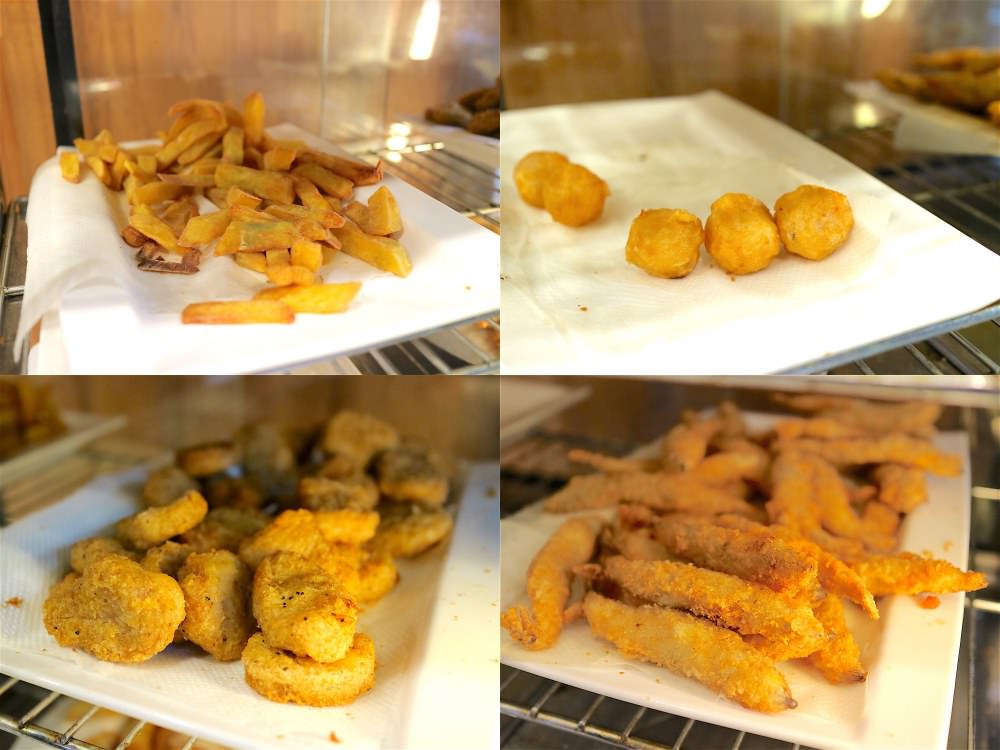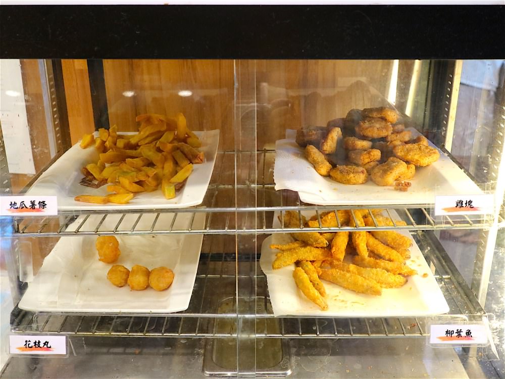 有四種炸物,提供選擇:地瓜薯條/雞塊/花枝丸/柳葉魚