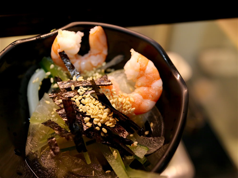 有著新鮮Q彈的兩尾鮮蝦,搭配冰涼的蔬菜絲,正下方是非常彈的烏龍麵,和風醬汁讓整體顯得清爽!