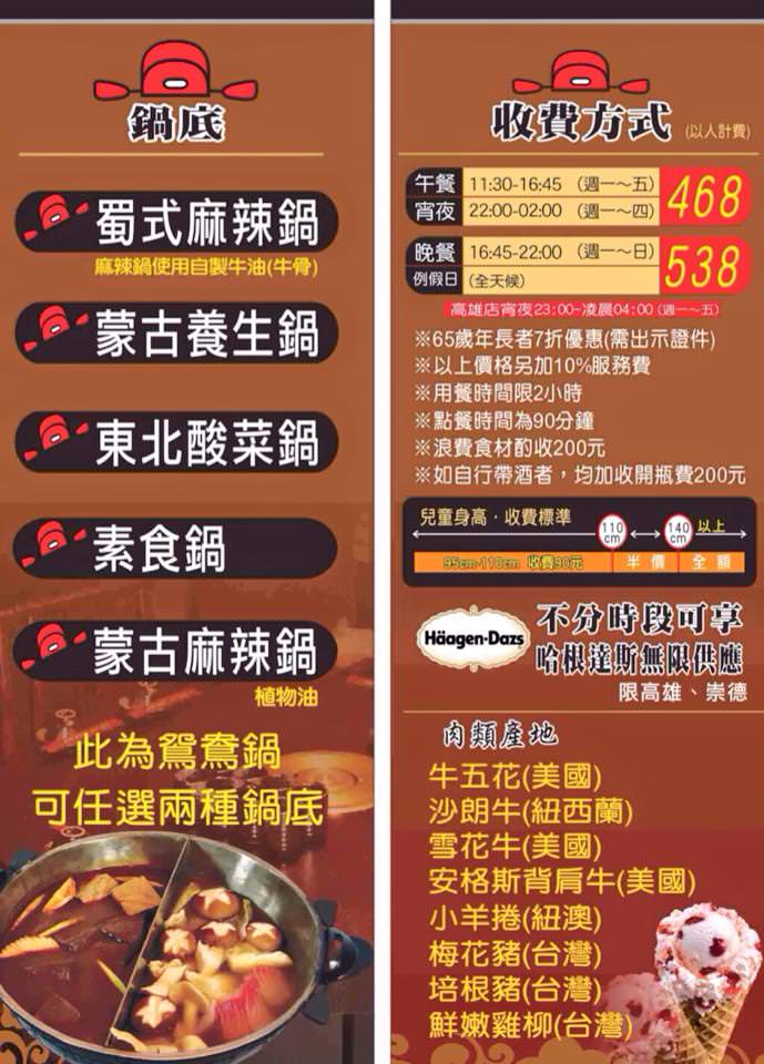 麻辣狀元菜單: 其實價格不算貴,除了平日午餐以外,平日晚餐、假日的價格都是一樣的,不另外加價,即使一個人來也是一樣的價格喔!六種湯底可選兩種作成鴛鴦鍋。此外,還有適合給不吃牛的人的蒙古麻辣鍋!一般的蜀式麻辣鍋店家是用牛骨熬的,蒙古麻辣鍋是用雞骨,口味比較不會這麼辣。