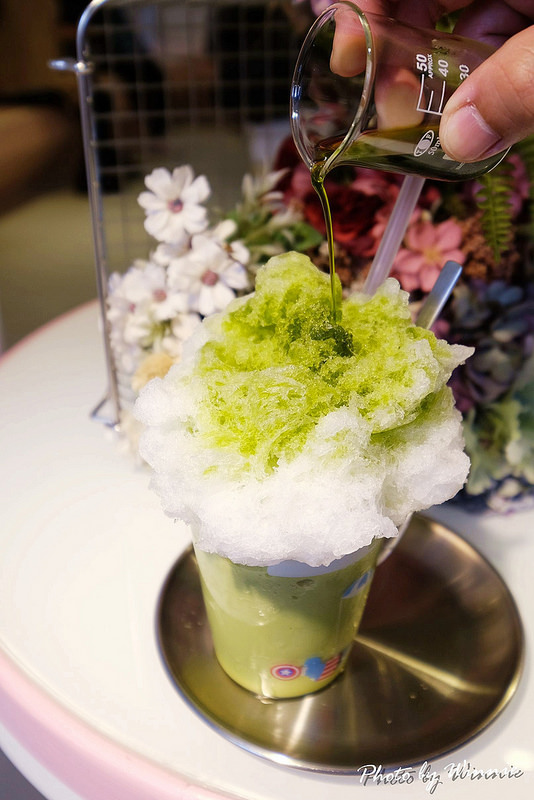 店家有先見之明所以下面還墊著一個小的鐵盤,淋上了綠色的抹茶汁後,就變成了一杯帶著漸層的冰涼飲品囉!