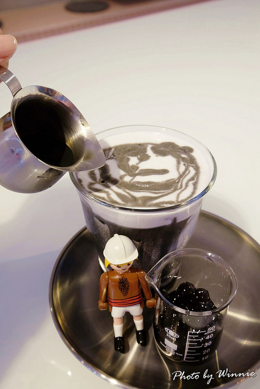 ▲大理石珍珠牛奶$130,上桌時牛奶、珍珠及sauce都是獨立分開放的,原先我以為黑黑的液體是芝麻來著,後來才知道原來是竹炭,倒入白色的牛奶中呈現出了不規則的黑色線條,覺得自已淋畫的還蠻時尚的呢!!(哈)本身的牛奶是不加糖,若是要調甜度則是可以放入珍珠攪拌一起使用,這樣甜度會剛剛好些!