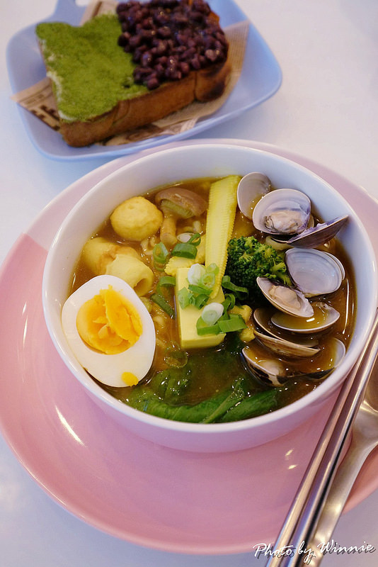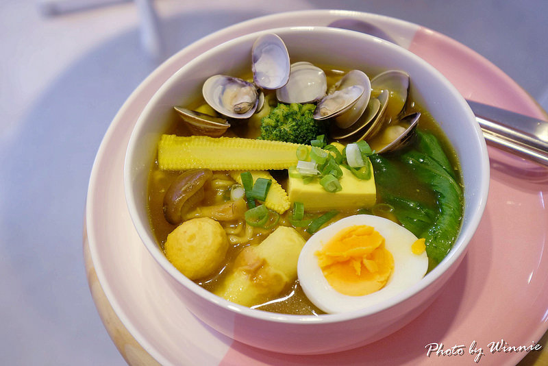 ▲咖哩與蛤蠣$150,朋友點的韓式拉麵餐點中其中的一個最不辣的選項,看起來還蠻兼顧營養的,有蛋、有青菜、海鮮等食材