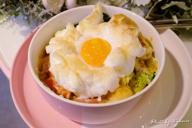 ▲晴天起司焗烤拉麵$160,韓國很流行的蛋白雲朵系列餐點,這兒也有供應…雲朵真的好可愛阿!!本身的雲朵吃起來是沒味道的,建議要拌著下面的麵條一起入口才有滋味唷~