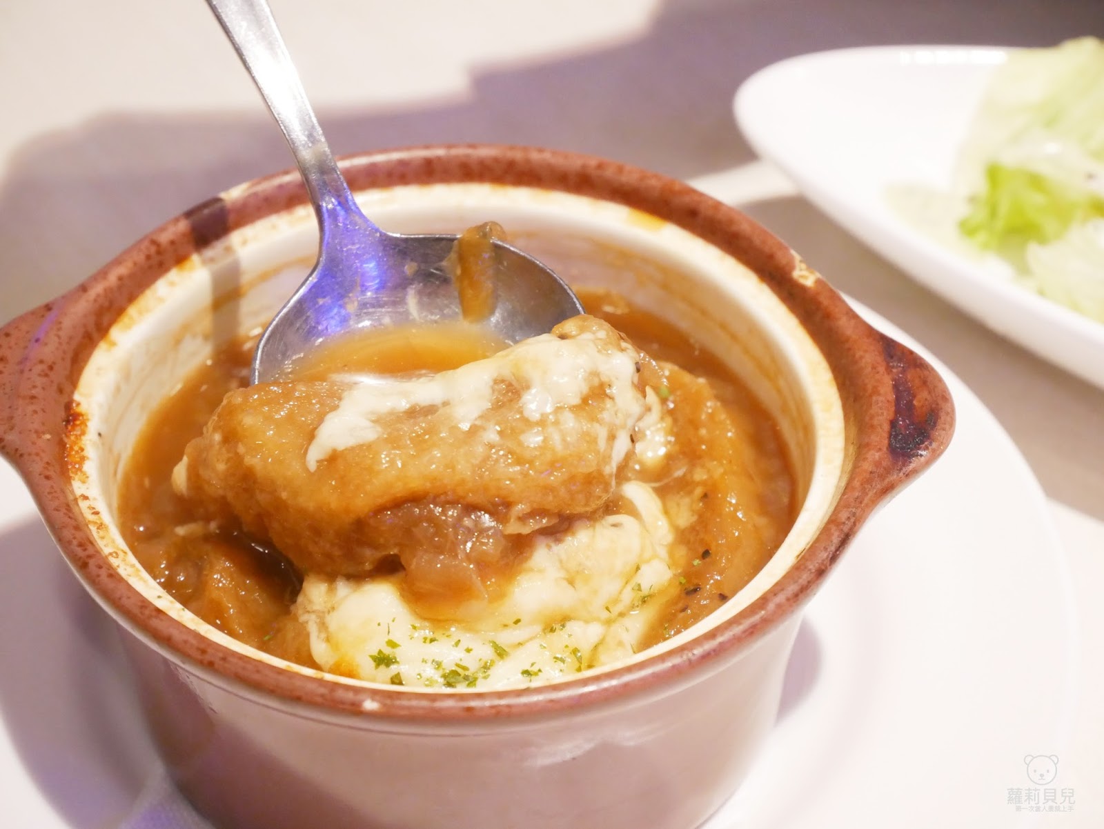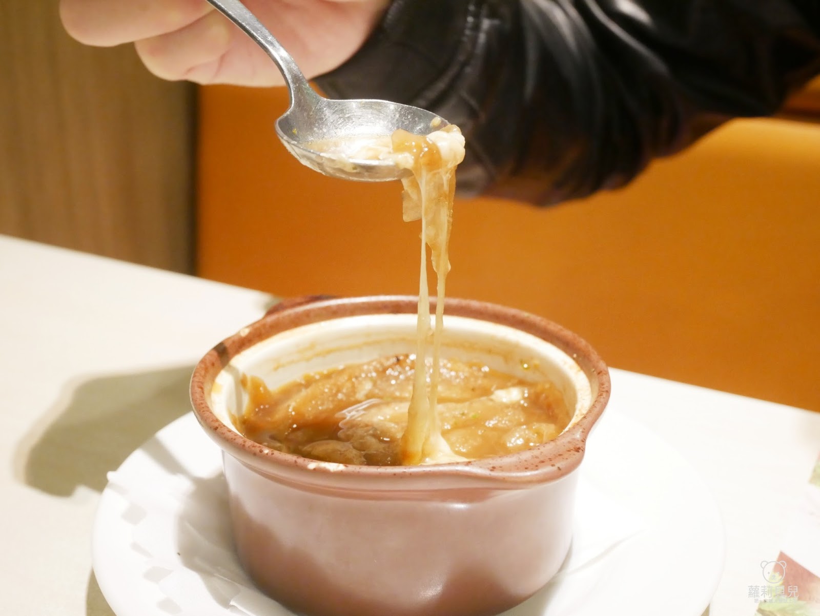 首先洋蔥湯必備的焗烤麵包還會牽絲