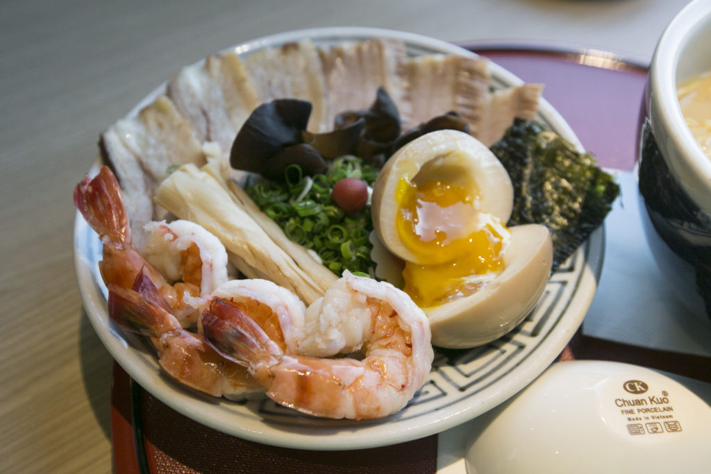 豪華拉麵 鹽味:盤子裡有筍乾、叉燒、木耳、蔥花以及魚板,上菜的時候看起來是典型拉麵,湯頭稍稍偏鹹,豬頰肉在台灣俗稱菊花肉、嘴邊肉,吃起來口感軟嫩,肉感層次分明,叉燒則是先經過烤過,不油膩