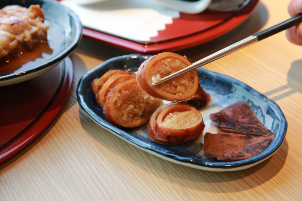 花枝飯:將滷過的花枝肚中塞入米飯,看起來相當美味的一道,章魚吃起來比較硬,但滷得入味