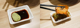 將肥厚的鮭魚稍微沾取一下芥末醬油