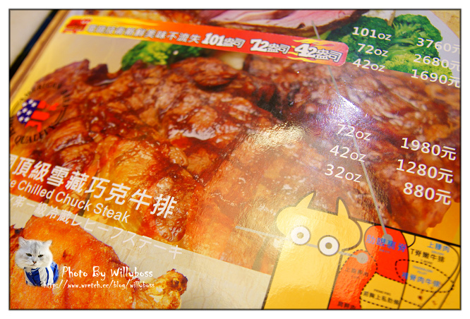 超大牛排分為美國頂級雪藏巧克牛排&紐西蘭電燒肋眼,以牛排喜好來說我是想點肋眼,不過顧慮到價位最後還是選擇了便宜很多的雪藏巧克,另外如果不吃牛也想挑戰大份量的朋友,這裡還有特大號的德國豬腳可以選擇XD。