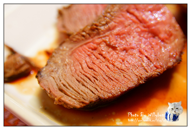 切了塊來嚐嚐,肉質其實不會像外表看起來的老,裡頭還保持著完美得七分熟度,吃起來相當柔嫩,味道感覺就是菲力牛排,純粹的瘦肉現在已經很難滿足我了XD。