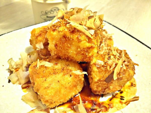 第一口咬下去讓我非常驚豔,雞蛋豆腐炸得很酥脆,裡頭嫩嫩的,再加上特製醬料與柴魚片,真的不浮誇的好吃!