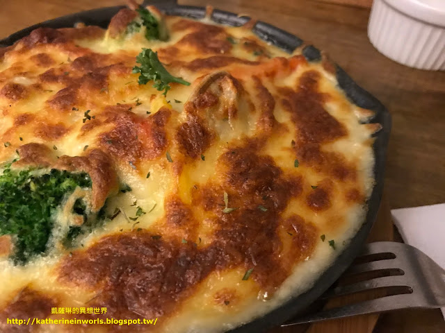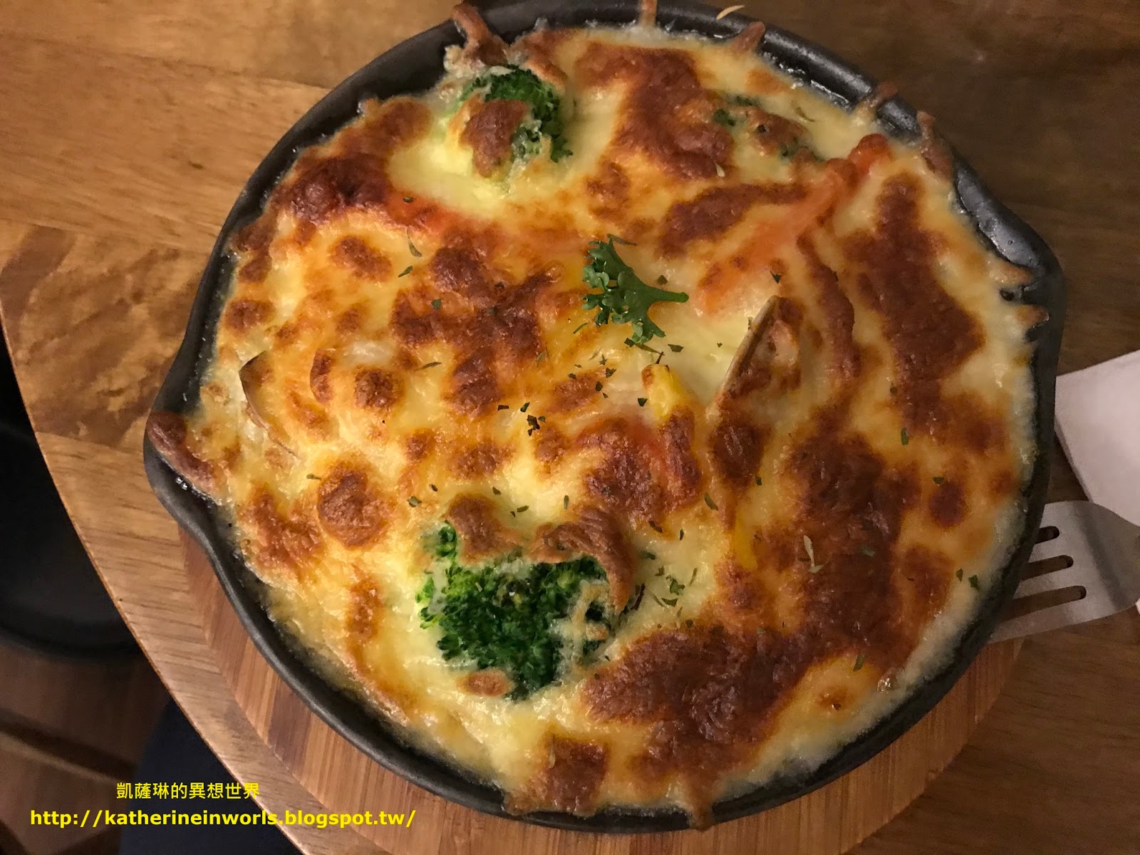 採用新鮮香料混炒蘑菇加入洋蔥燻雞佐自製醬料,加上起司烘烤而成。