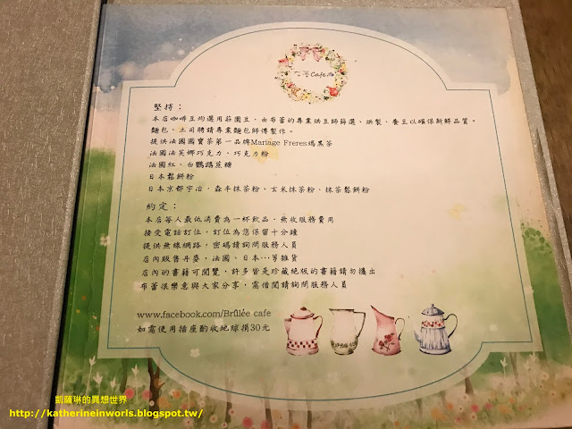 每次來訪時,總是靜靜喝著咖啡拿鐵及紅茶歐蕾系列,對於店家與客人約定每人最低消費為一杯飲品,不收服務費用,備感窩心,讓凱薩琳能有個地方,能安安靜靜的敲著鍵盤,記錄著在世界各地的足跡。偷偷與店家約定,下次光臨時,必定點杯法國瑪黑茶系列,品嘗著布蕾精心挑選的好茶。