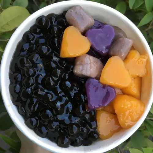 綜合芋園有地瓜、芋圓、抹茶口味,最特別的是,芋圓裡還添加了黑芝麻,更增添了滑Q以及香氣