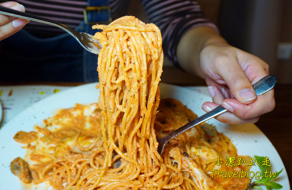 義大利麵上桌時那份量之驚人,老實說一上桌小潔真的被份量嚇到歪腰,整個超大一盤!