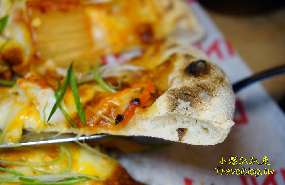 Pizza經過高溫窯烤爐烘烤,餅皮比一般的薄脆餅皮且略厚一些,咬下去頗酥脆,中間帶一點點Q軟,蠻特別的餅皮!