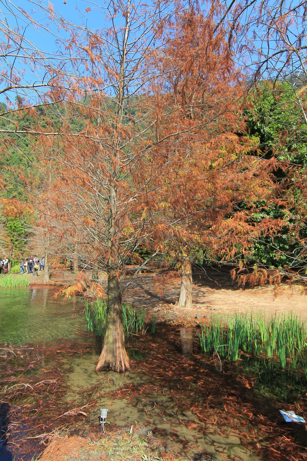 超美的紅色落羽松已變色,透明湖畔倒影,