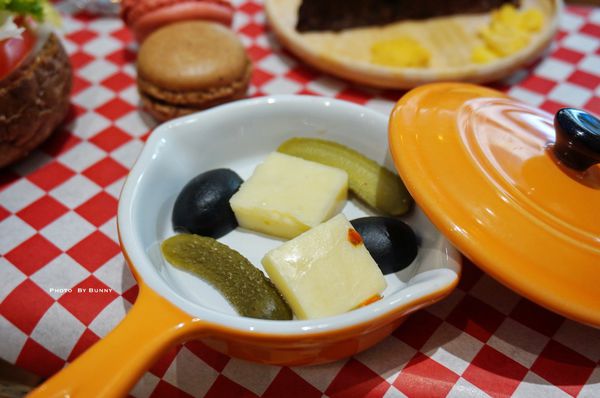 可以先品嚐小瓷鍋內的橄欖、酸黃瓜及乳酪,