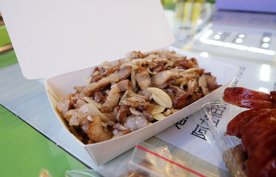 老闆娘會將鹹豬肉跟滷大腸和蒜片洋蔥絲一起下去拌炒